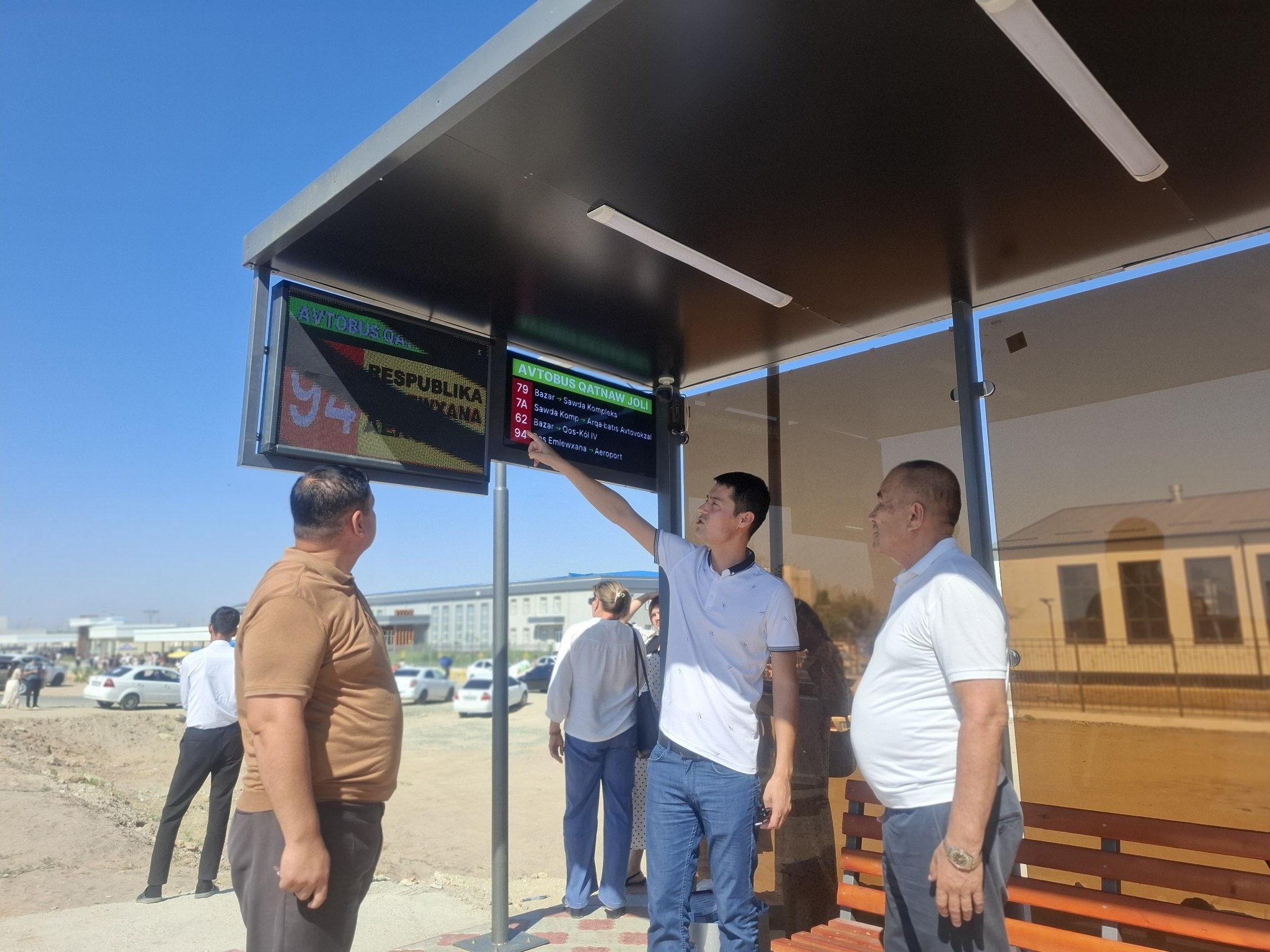 Jámiyetlik monitoring ilájları dawamında Nókis avtovokzalında alıp barılıp atırǵan rekonstrukciya jumısları menen tanıstı, avtobuslar ushın arnalǵan A palasa hám jańadan salınıp atırǵan zamanagóy bándirgilerdi kózden keshirdi.